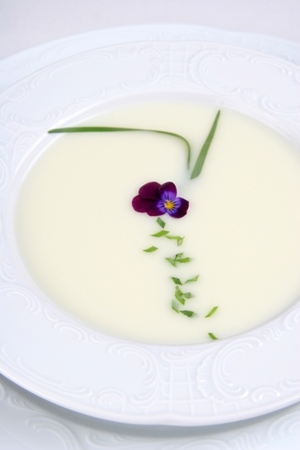 Garnish with chopped chives and edible flowers if you have them. Shown in the photo are 'Johnny Jump-ups' from the Grail Springs garden.