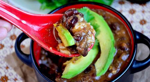 Ladle into blender and process until pureed. Pour the mixture through a metal mesh strainer to remove bean pulp. Return to low heat. Adjust seasoning if required. Add more stock depending on thickness you desire. A delicious way to garnish this soup is with a dab of organic yogurt, cilantro leaf and sliced avocado.